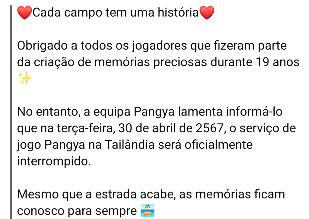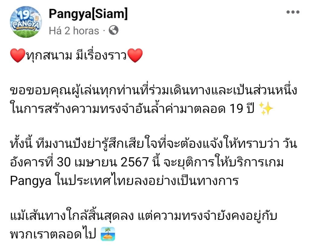 A página do Pangya no Facebook anunciou o encerramento do serviço de jogos do Pangya após mais de 19 anos de operação. O site e a página do Facebook serão encerrados no dia 30 de abril.