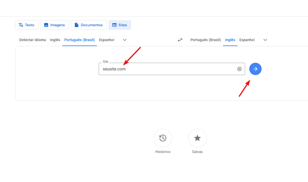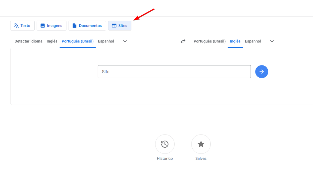 Primeiro siga para a página do google tradutor: https://translate.google.com/?sl=pt&tl=en&op=websites